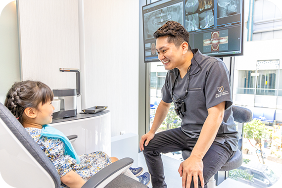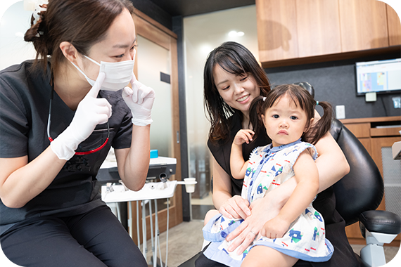 お子さんのお口の健康を生涯守るためには、お子さんが歯科医院を怖がったり嫌がったりすることなく、定期的に通院していただくことが大切です。そのため当院では、お子さんとのコミュニケーションを大切にした上での診療に努めています。歯科医院を身近に感じていただき、前向きに受診いただくことで、お口の健康はもちろん、将来的な財産となる歯を大切に残すことができます。