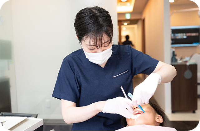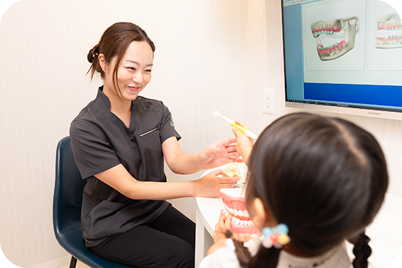 お子さん一人ひとりの年齢やお口の状態に合わせたブラッシング指導を行います。歯のみがき方を楽しく学びながら、正しい歯みがき習慣を身につけることができます。保護者のかたにも仕上げみがきのコツをお伝えし、ご家庭でのケアをサポートしています。