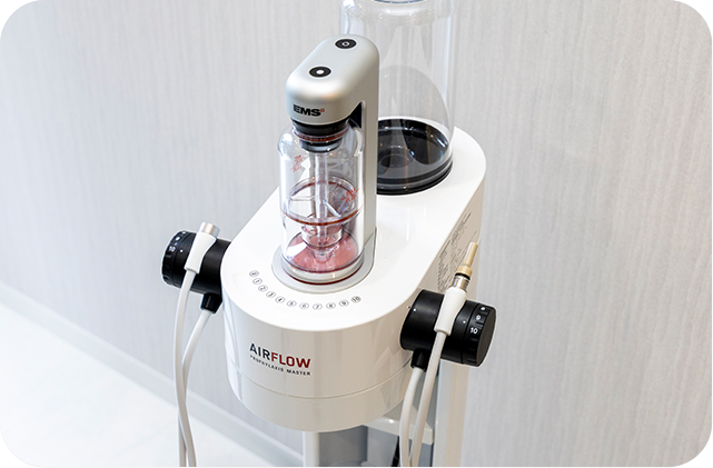 当院では、スケーリングやブラッシング指導といった基本的な予防処置に加え、場合によりエアフローを使用したクリーニングも行っています。エアフローは微細なパウダーと水流を利用して歯面を優しく清掃できるため、子どもの柔らかい歯にもダメージを与えにくいのが特長です。また、従来のクリーニングで気になりがちな不快な金属音も軽減できるため、歯医者さんが苦手なお子さんでも安心して受けられる予防ケアを提供しています。健やかな成長に向け、痛みやストレスの少ないケアを心掛けています。